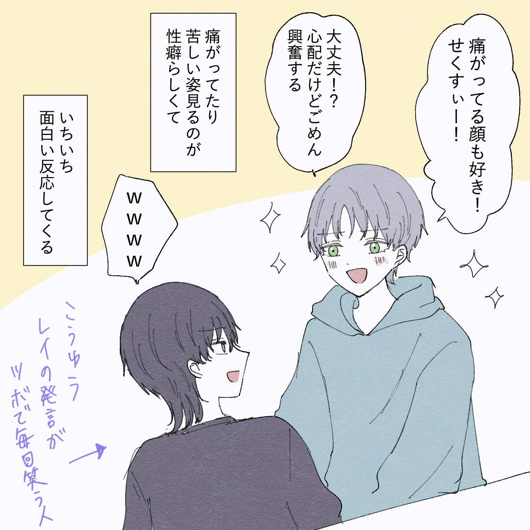 レイの性癖2023.03.06性癖 可愛い顔してエグいこと言うから面白いギャップがツボで面白いんですよね😂本気でしんどい時はそんな事言わずにしっかり看病してくれるので頼りになります。笑 3 同じカテゴリの記事 レイの性癖 【性癖】ガムテープの話 前の記事 コンビニ行く? 2023.03.06次の記事 癖強なれそめ【31】 2023.04.16アプリなら通知ですぐ読める! NAPBIZブログ